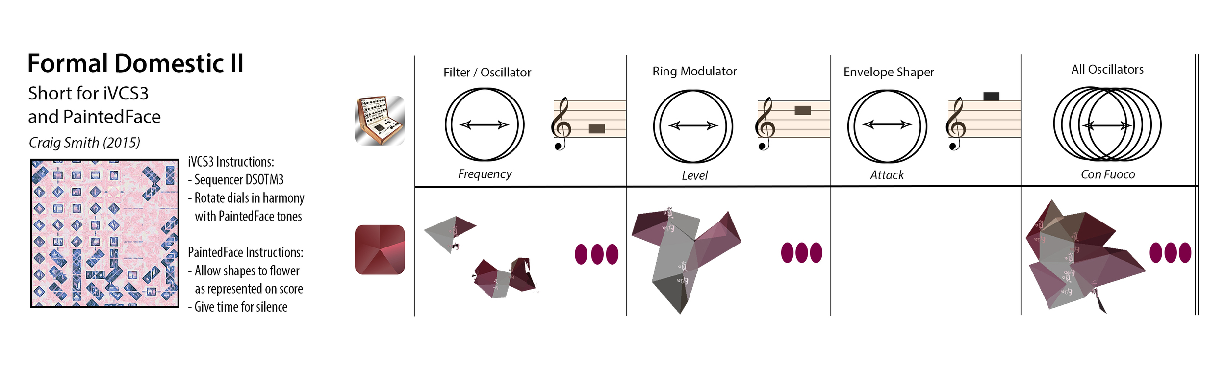 A second composition, 'Formal Domestic II', use two very different iPad apps - one, an interactive art project called The Painted Face, and the other a synthesiser emulator, iVCS3. I utilised a more interpretative visual format this time, divided into four discrete bars. For the iVCS3 synth, I used circles to represent the dials on the synth interface, with text to designate the dial to be manipulated during that bar, followed by a note to be played on the keyboard as that part of the bar was reached. The final bar for the synth shows overlapping circles with the note that all oscillator dials can be manipulated at this point, with the performance instruction of Con Fuoco, 'with fire'.