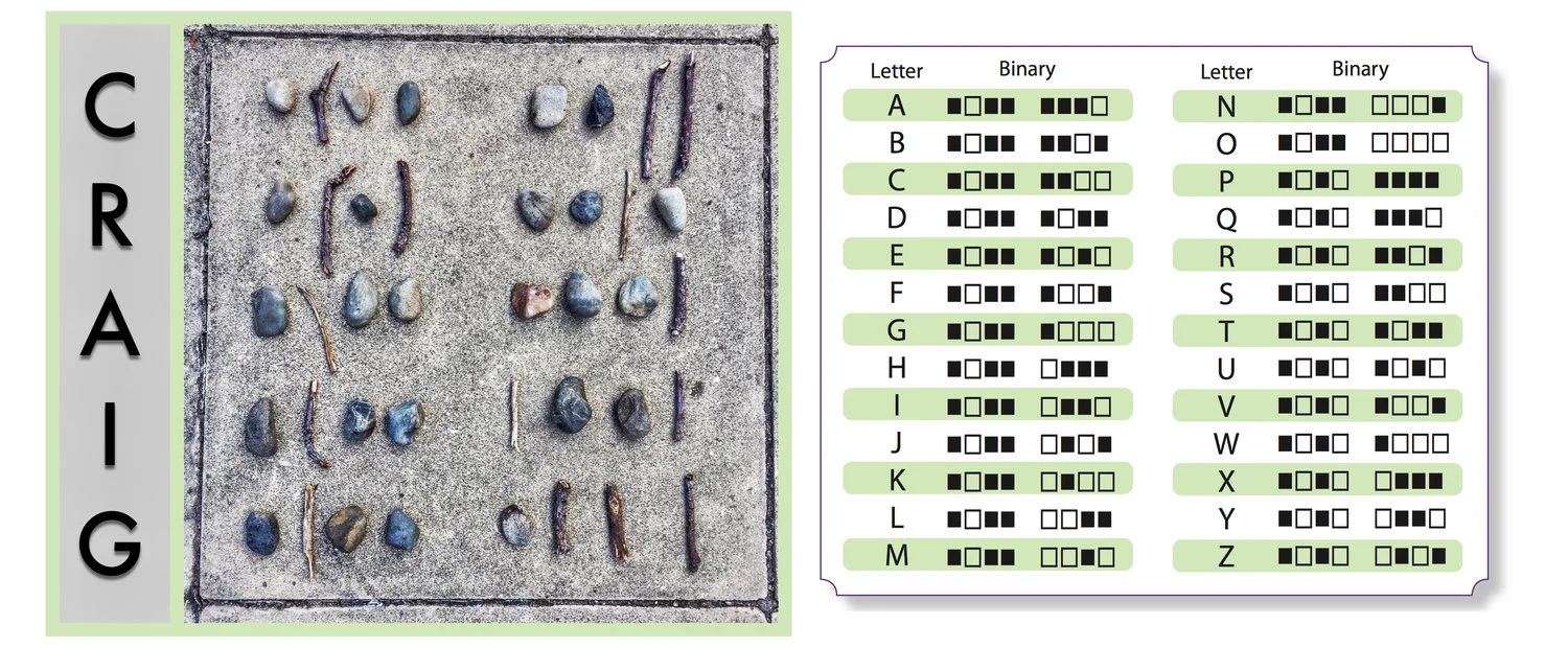 The other version of this activity is to communicate with binary code instead of morse code. This is a fun further exploration of coding ideas, and is something we include in many of our coding learning experiences. We provide students with a sheet of binary code symbols that represent different letters across the alphabet, and then students write out their name on the ground using rocks and sticks to represent the 1s and 0s of binary code. Then, after they have completed their name written out in binary with rocks and sticks, students can learn how to play their binary name using Skoog. Students can use two different pitched notes to represent the difference between a 1 and a 0. For example, a high note might be a 1 and a low note might be a 0. This extends the performance level of this communication activity beyond one note played on Skoog to represent shot and long for morse code, extending the performance to two notes to represent high and low notes for binary 1s and 0s. Again, this is a terrific lesson to film and turn into an iMovie or Book Creator project.