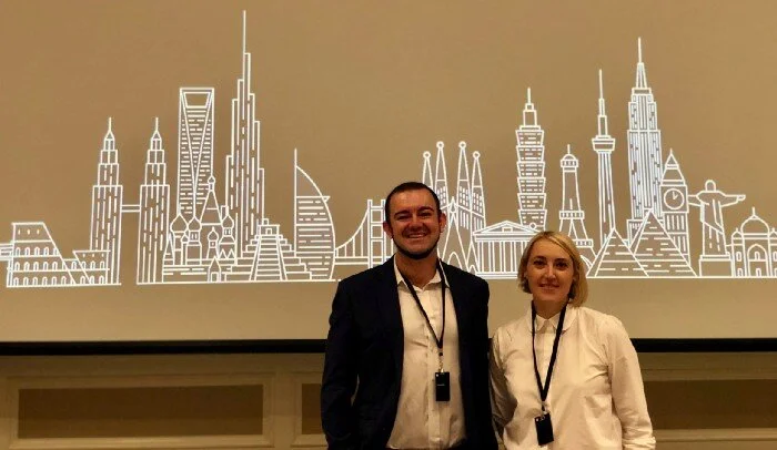 Photo above of two educators, Craig Smith and Karen Hart, wearing professional attire and lanyards, standing in front of a projection screen displaying an outline of famous buildings from around the world.
